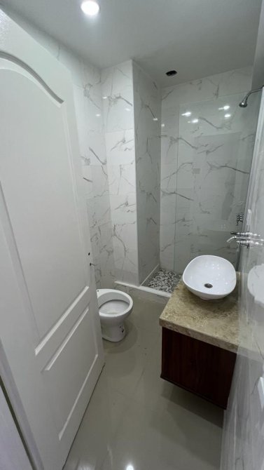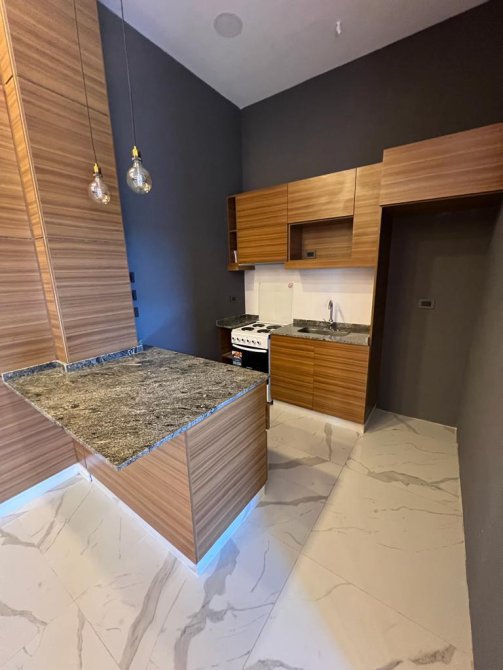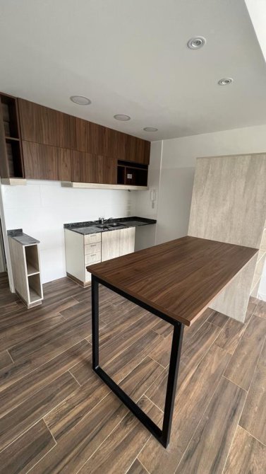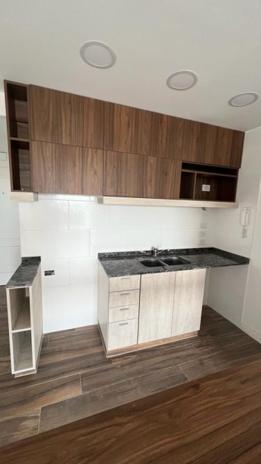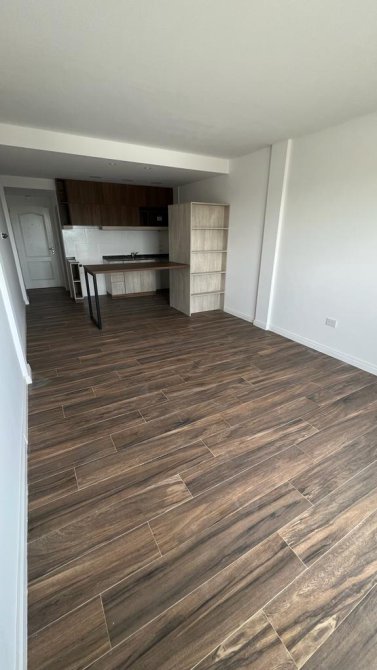 Pisos de porcelanato simil madera, cocina con mueble bajo y sobre mesada, muy moderna, espacio para microondas, anafe y horno electrico, espacio para heladera y lavarropas. Amplia mesa desayunadora. Mueble con estantes. Con balcón francés. Baño completo revestido con porcelanato simil marmol, vanitory y mampara de vidrio. Aberturas de aluminio de primera calidad.
