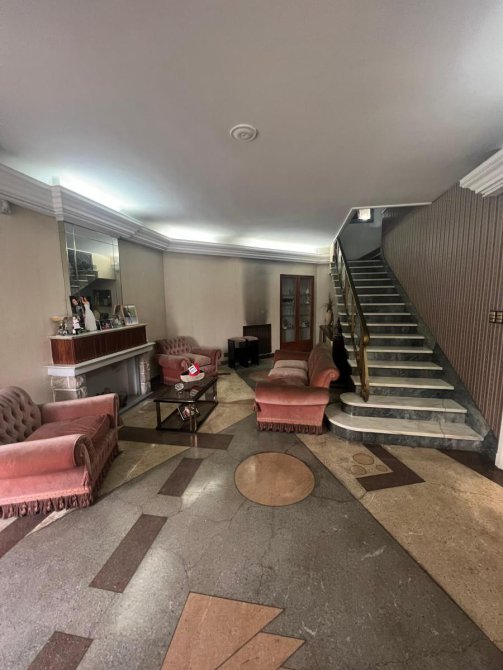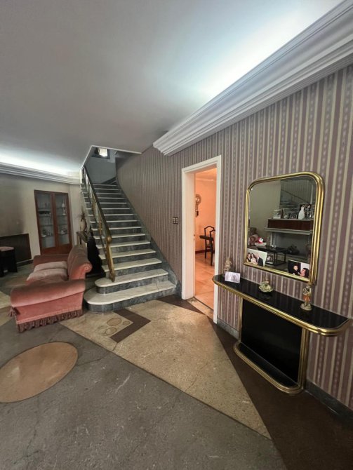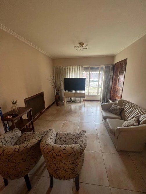 Jardin delantero. Entrada a gran living con hogar e importante escalera. Luego, living comedor con ventana al frente.