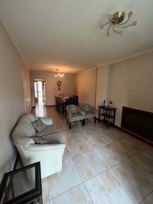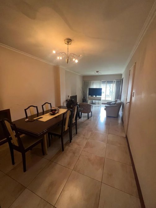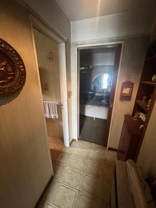 Entrada a cocina comedor con gran mueble de madera con bajo y sobre mesada. Hall con mueble de guardado.