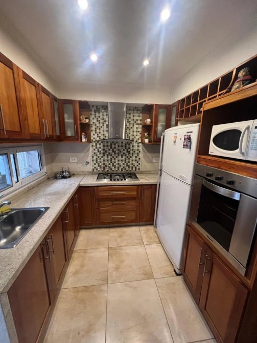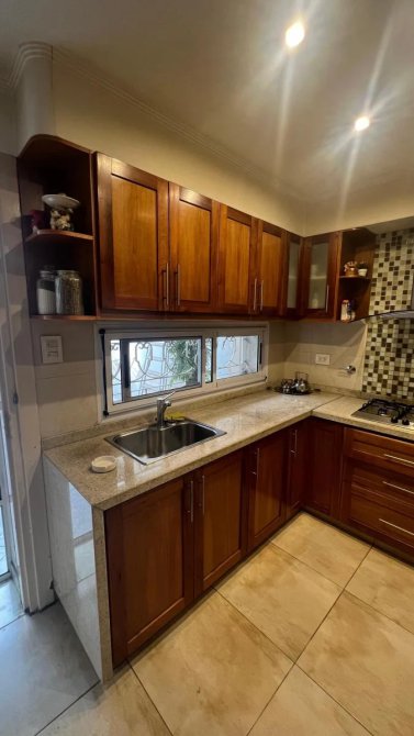 Cocina con bajo y sobre mesada, con campana, espacio para heladera y microondas, horno. Con ventana y salida al patio techado.