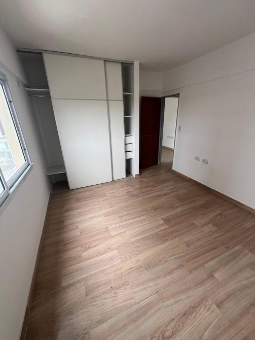 Dormitorio muy luminoso con piso de madera. Gran placard hasta el techo con puertas corredizas.