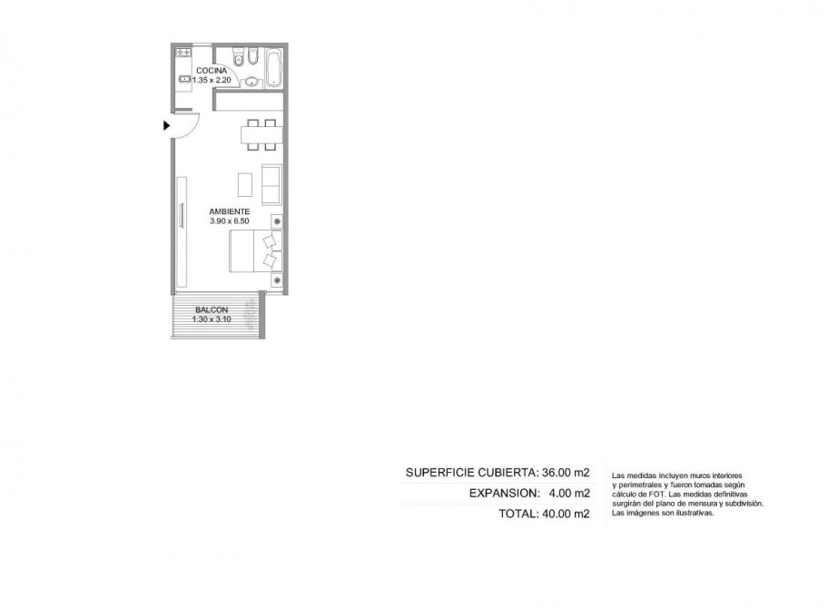 Ambiente amplio de 3,90 x 6,50. Muy luminoso, con espacio para juego de living, juego de comedor y cama. Ventanal con salida al balcon de 1,30 x 3,10. Cocina separa de 1,35 x 2,20. Bano completo con vanitory y banera.