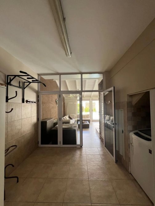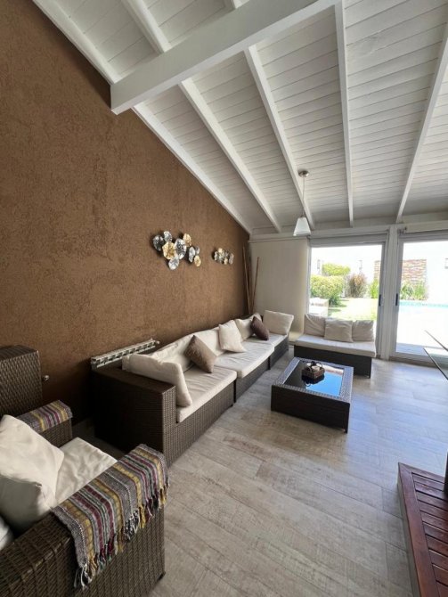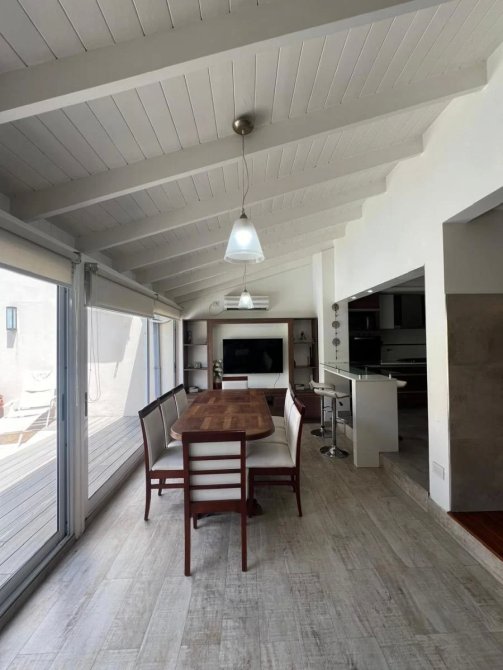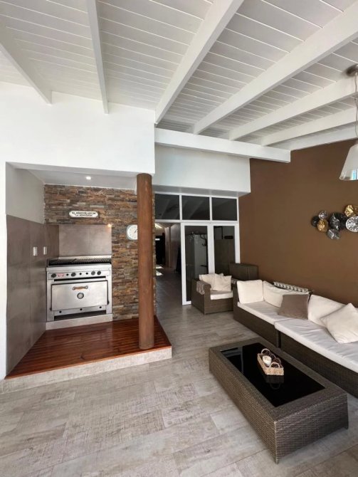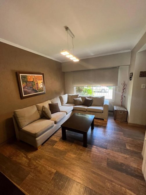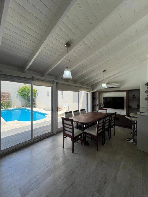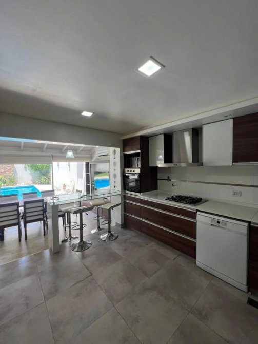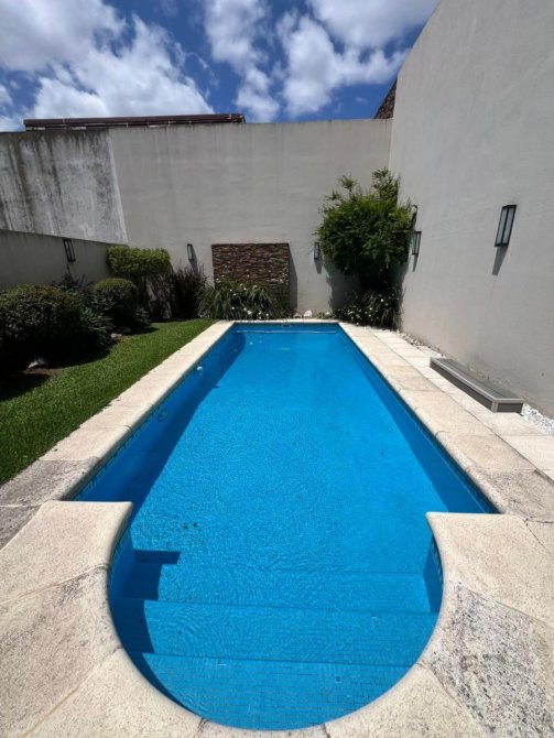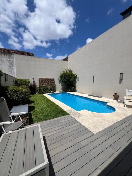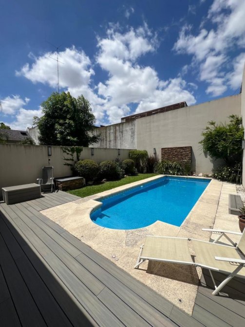 Planta baja: Rejas. Jardin delantero. Pequeno hall de entrada. Entrada al living, espacioso y muy luminoso ya que cuenta con gran ventana hacia el frente. Toilette de recepcion moderno: detalles con venecitas, inodoro negro, bacha y luces en el espejo. Gran mueble de cocina, con bajo y sobre mesada, horno y anafe, mesa desayunadora. Living comedor, muy amplio ventanal hacia el fondo, luminoso, mueble tipo rack de tv. Espacio con parrilla a gas de primera calidad, tambien con mesa desayunadora. Hermoso fondo, con gran piscina con preinstalación de conexión de gas para climatizarla, espacio de solarium y parquizado. Cochera cubierta con porton automatico, capacidad de dos vehiculos.