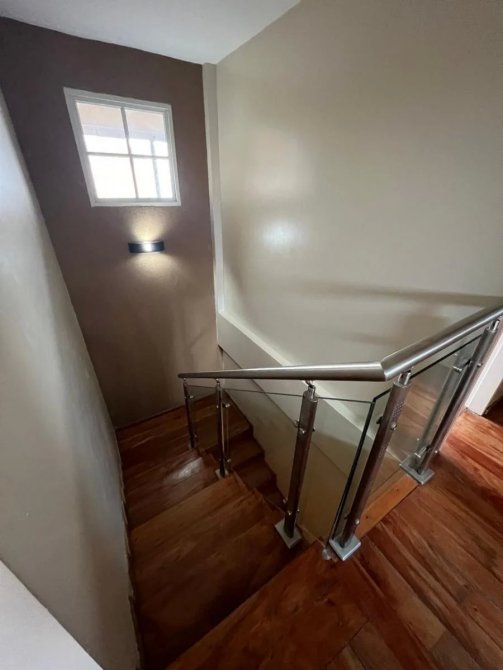 Escalera de madera con baranda de vidrio hacia la planta alta.