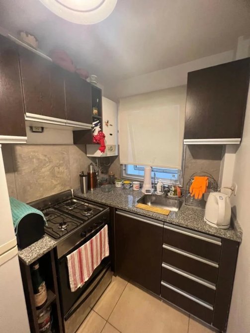 La cocina cuenta con muebles color madera con lavarropas, heladera, microondas. Bano moderno, con vanitory, espejo y bañera. LISTO PARA MUDARSE.