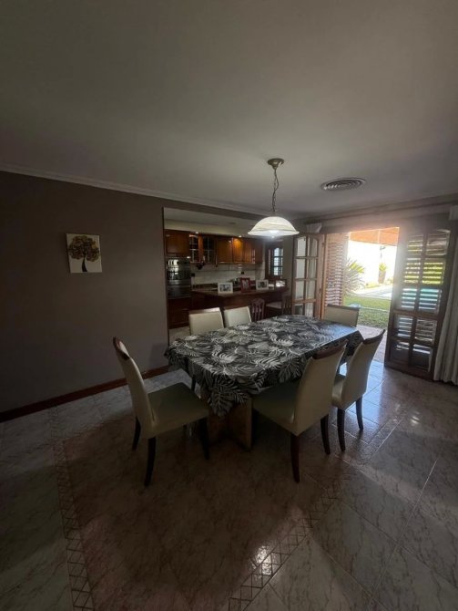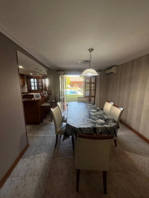 Cocina comedor con salida al fondo, muy amplio y luminoso, con acceso a las cocheras. Cocina con importante mueble bajo y sobre mesada de roble macizo con anafe y horno empotrado. Al lateral puerta con acceso a la despensa. Mesa desayunadora. Aire acondicionado.
