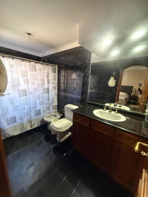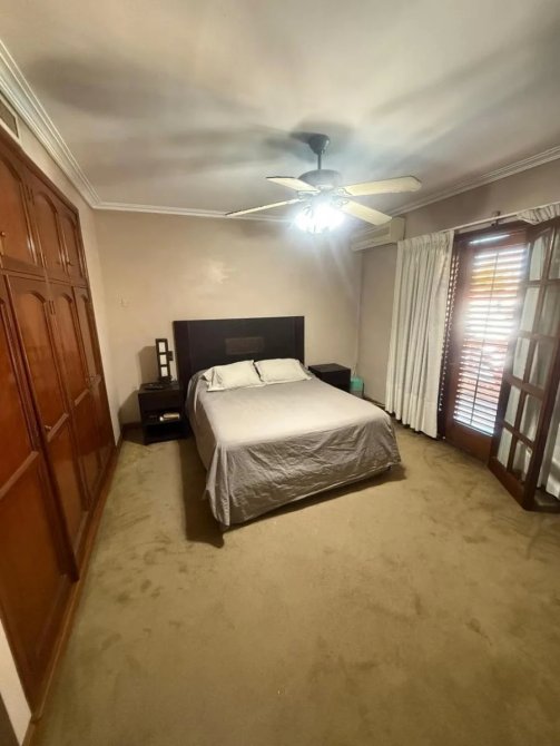 Dormitorio principal en suite con placard empotrado hasta al techo, ventilador de techo, salida a balcon. Piso de alfombra en excelente estado. Bano completo con banera con hidromasaje, vanitory, espejo.