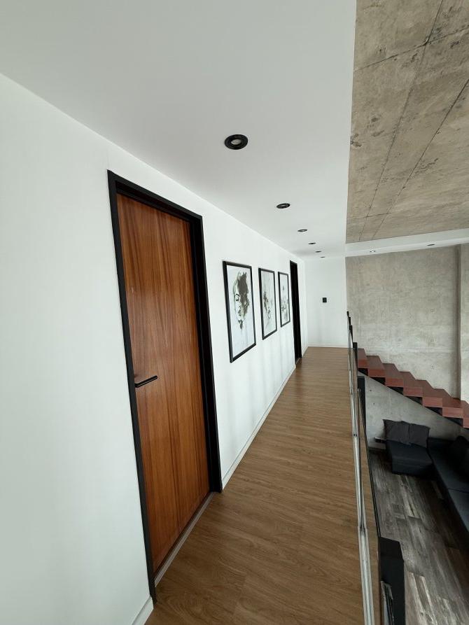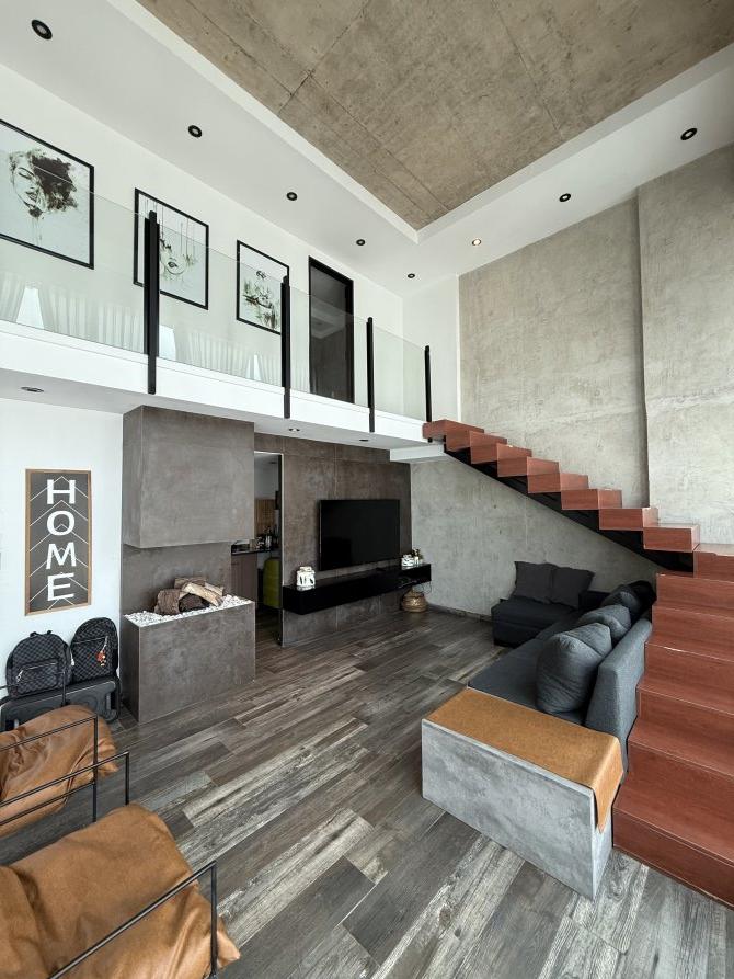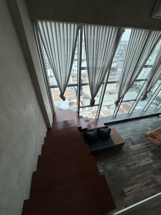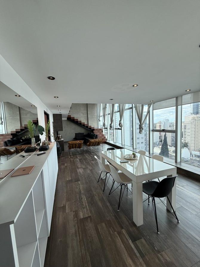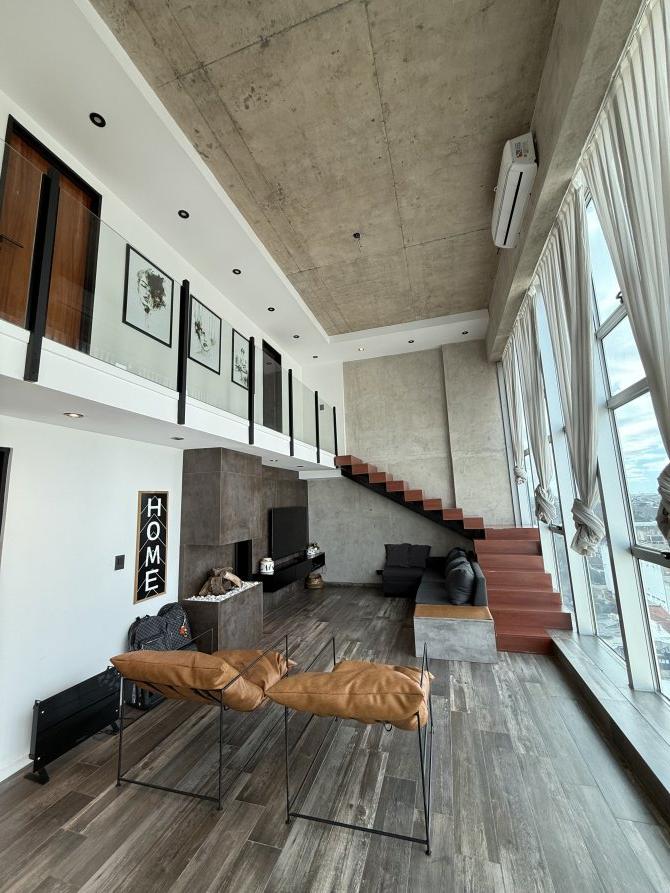 Amplio living-comedor con doble altura, ventanales de piso a techo que brindan luminosidad natural durante todo el día y detalles de diseño como paredes en hormigón visto y pisos de madera. Aire acondicionado frio calor.