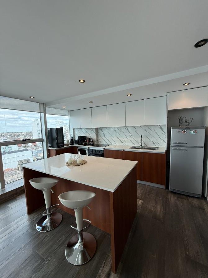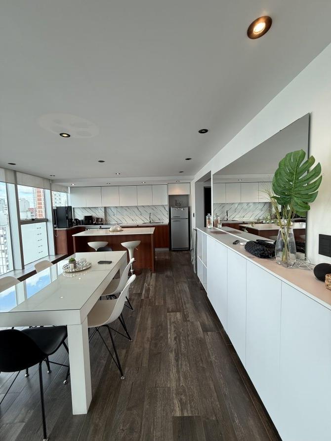 Cocina integrada, equipada con muebles a medida, bajo y sobre mesada, barra desayunadora y gran espacio de guardado. Ademas cuenta con la conexion para lavavajillas.