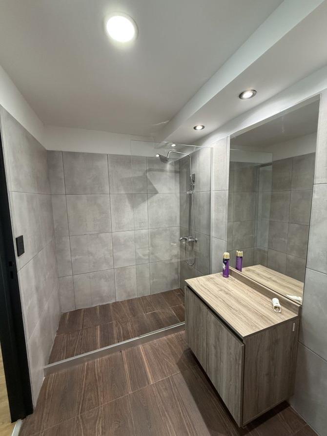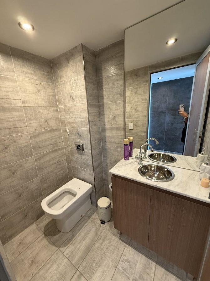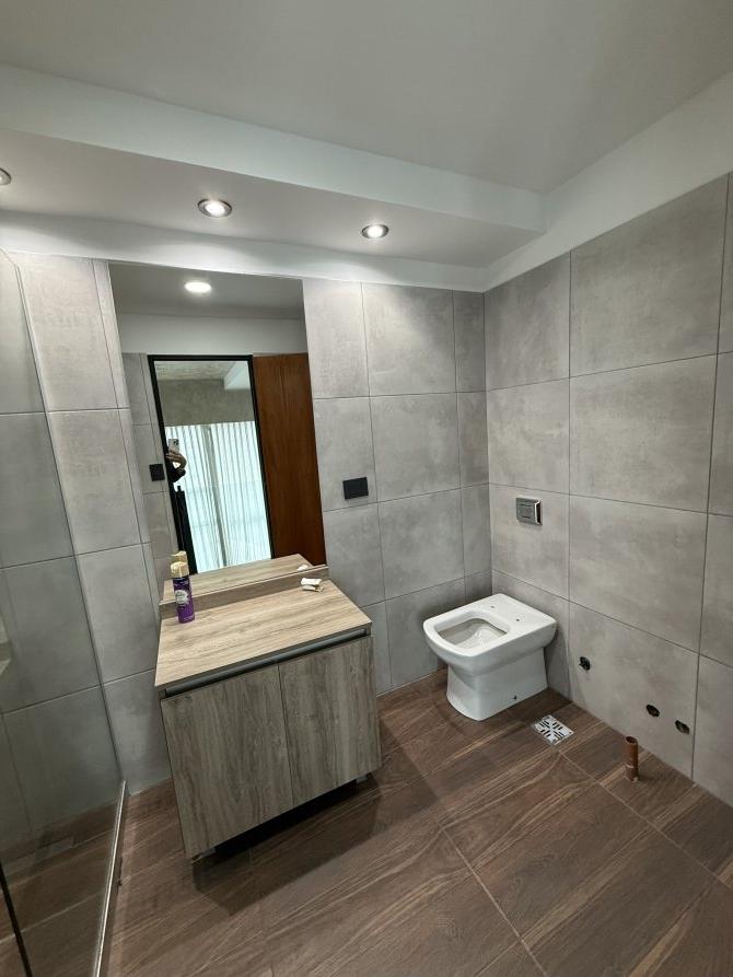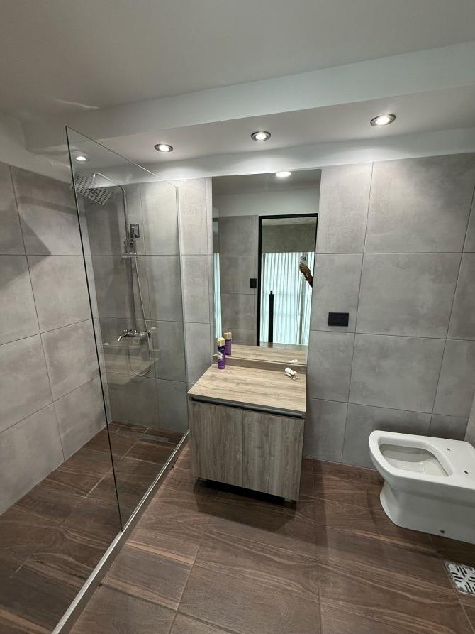 Baño completo con artefactos de calidad y revestimientos modernos. Ducha con mampara de vidrio, vanitory y espejo.
