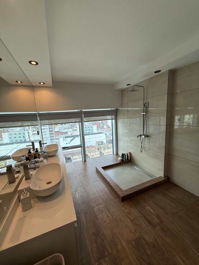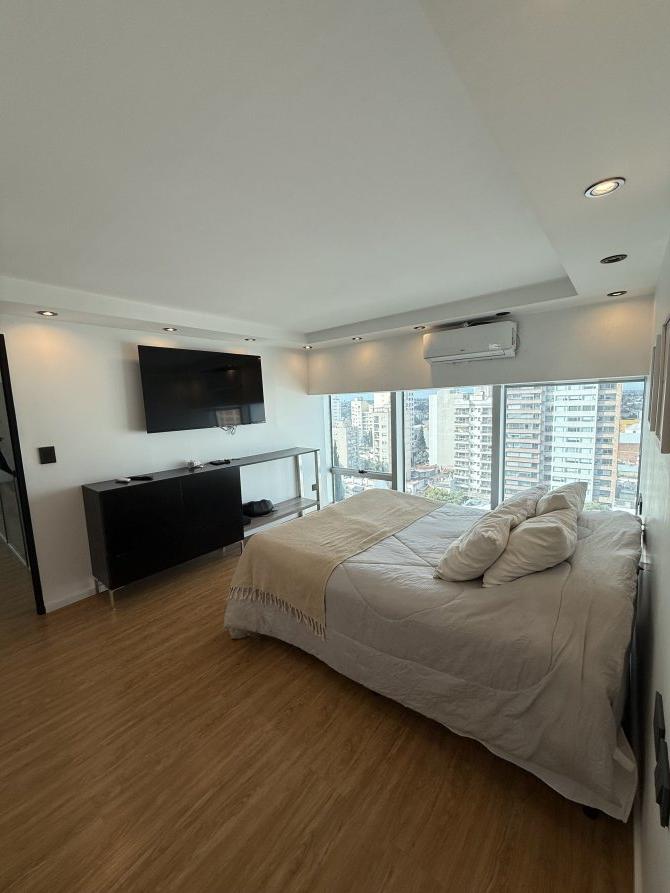 Dormitorio principal muy amplio, con aire acondicionado, excelente iluminación y vista privilegiada a la ciudad. Baño en suite, con doble bacha sobre mesada de mármol, vanitory, ducha y grifería de primera línea. Vestidor independiente, con excelente capacidad de guardado. Aire acondicionado frio calor.